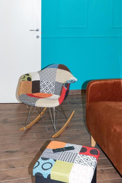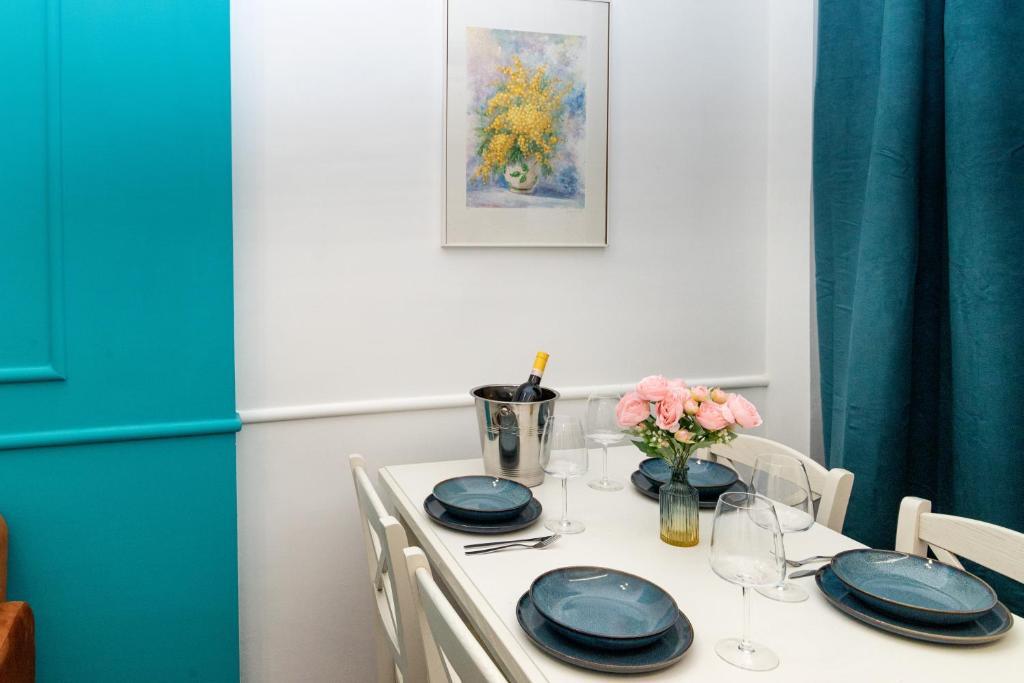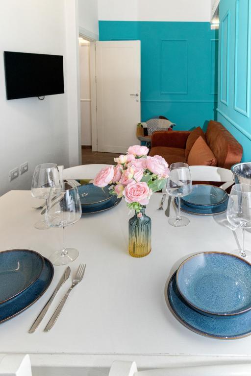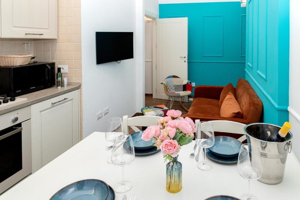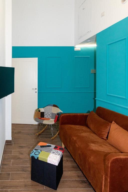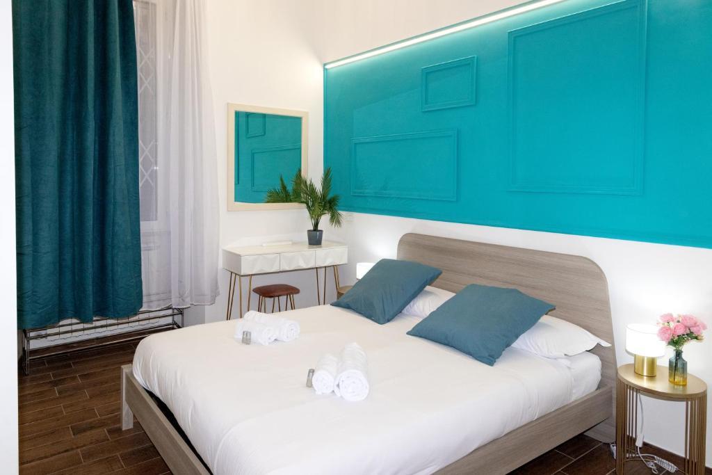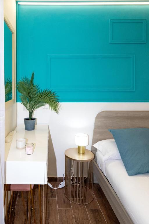 Il San Giovanni prestige flat è un elegante appartamento caratterizzato da una camera con pannelli turchesi, arredi moderni e finiture dorate.
