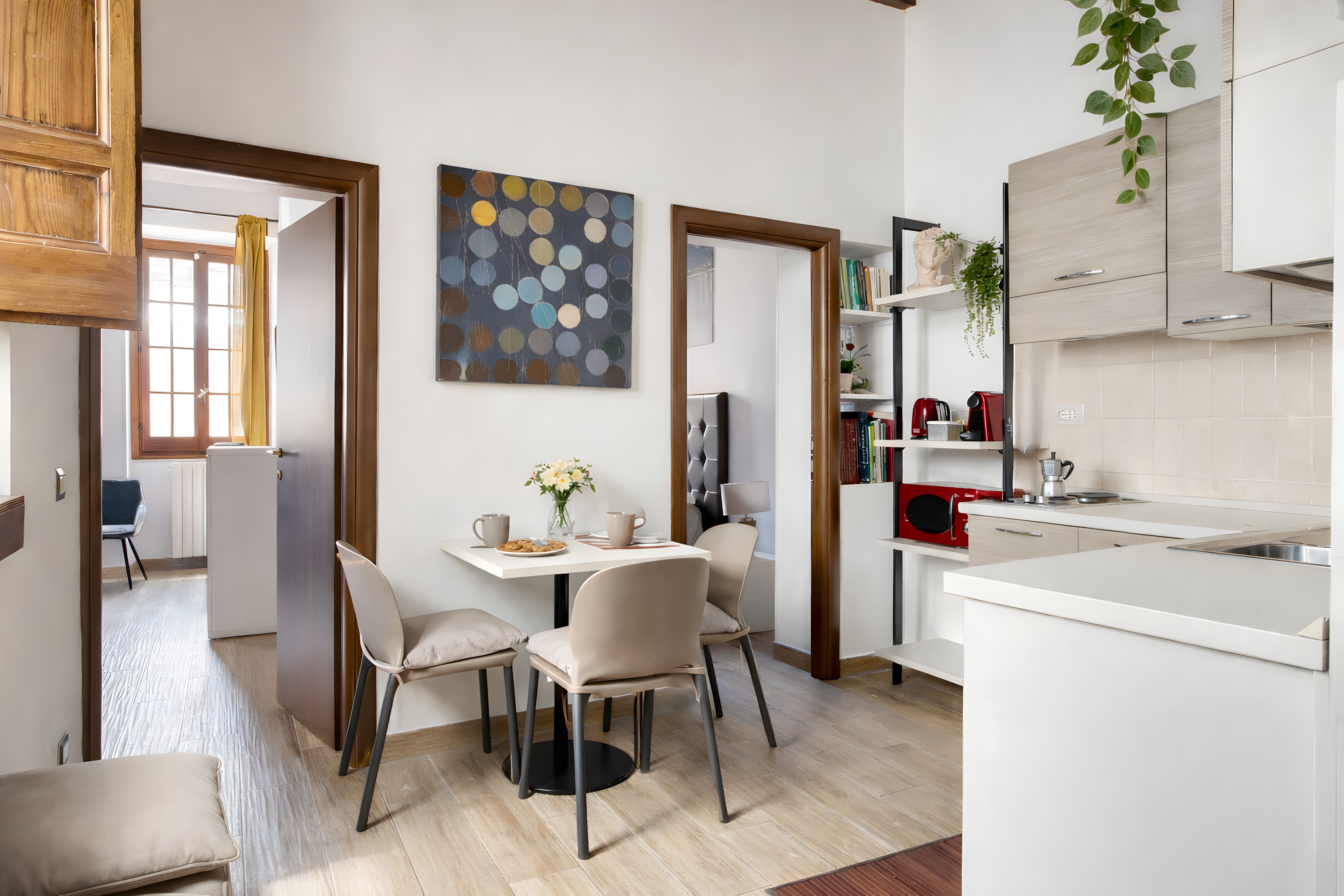 La zona circostante è ricca di ristoranti, bar, locali caratteristici, boutique vintage e servizi di ogni tipo. Monti è uno dei quartieri più iconici di Roma, perfetto per immergersi nella vita urbana tra storia millenaria, scorci pittoreschi e una vivace atmosfera serale.